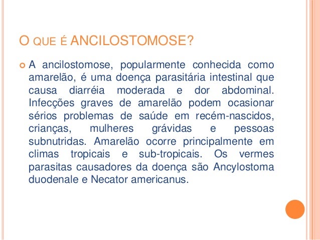 - 2. O QUE É ANCILOSTOMOSE? A ancilostomose, popularmente conhecida como amarelão, é uma doença parasitária intestinal que causa diarréia moderada e dor abdominal. Infecções graves de amarelão podem ocasionar sérios problemas de saúde em recém-nascidos, crianças, mulheres grávidas e pessoas subnutridas. Amarelão ocorre principalmente em climas tropicais e sub-tropicais. Os vermes parasitas causadores da doença são Ancylostoma duodenale e Necator americanus.