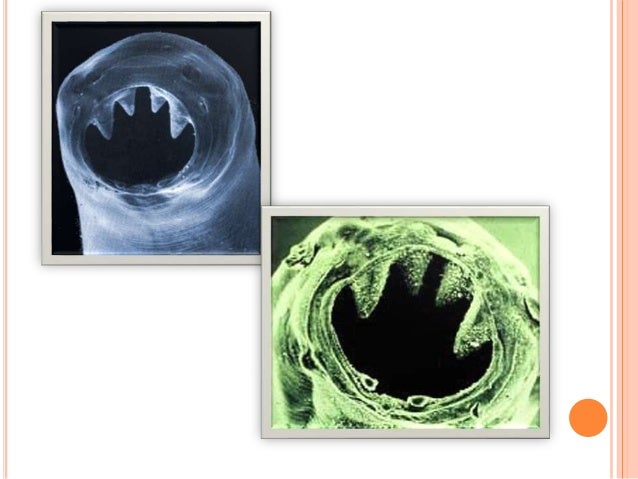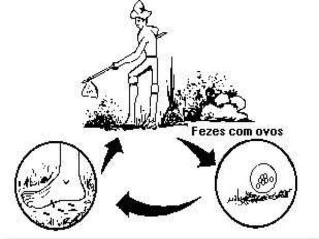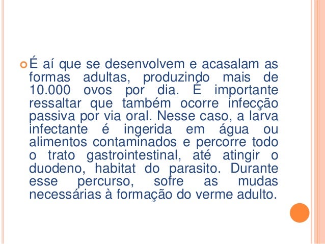 - 4. É aí que se desenvolvem e acasalam as formas adultas, produzindo mais de 10.000 ovos por dia. É importante ressaltar que também ocorre infecção passiva por via oral. Nesse caso, a larva infectante é ingerida em água ou alimentos contaminados e percorre todo o trato gastrointestinal, até atingir o duodeno, habitat do parasito. Durante esse percurso, sofre as mudas necessárias à formação do verme adulto.