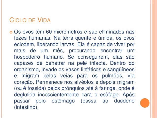 - 3. CICLO DE VIDA Os ovos têm 60 micrómetros e são eliminados nas fezes humanas. Na terra quente e úmida, os ovos eclodem, liberando larvas. Ela é capaz de viver por mais de um mês, procurando encontrar um hospedeiro humano. Se conseguirem, elas são capazes de penetrar na pele intacta. Dentro do organismo, invade os vasos linfáticos e sangüíneos e migram pelas veias para os pulmões, via coração. Permanece nos alvéolos e depois migram (ou é tossida) pelos brônquios até à faringe, onde é deglutida incoscientemente para o esôfago. Após passar pelo estômago (passa ao duodeno (intestino).