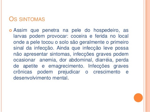- 5. OS SINTOMAS Assim que penetra na pele do hospedeiro, as larvas podem provocar: coceira e ferida no local onde a pele tocou o solo são geralmente o primeiro sinal da infecção. Ainda que infecção leve possa não apresentar sintomas, infecções graves podem ocasionar anemia, dor abdominal, diarréia, perda de apetite e emagrecimento. Infecções graves crônicas podem prejudicar o crescimento e desenvolvimento mental.